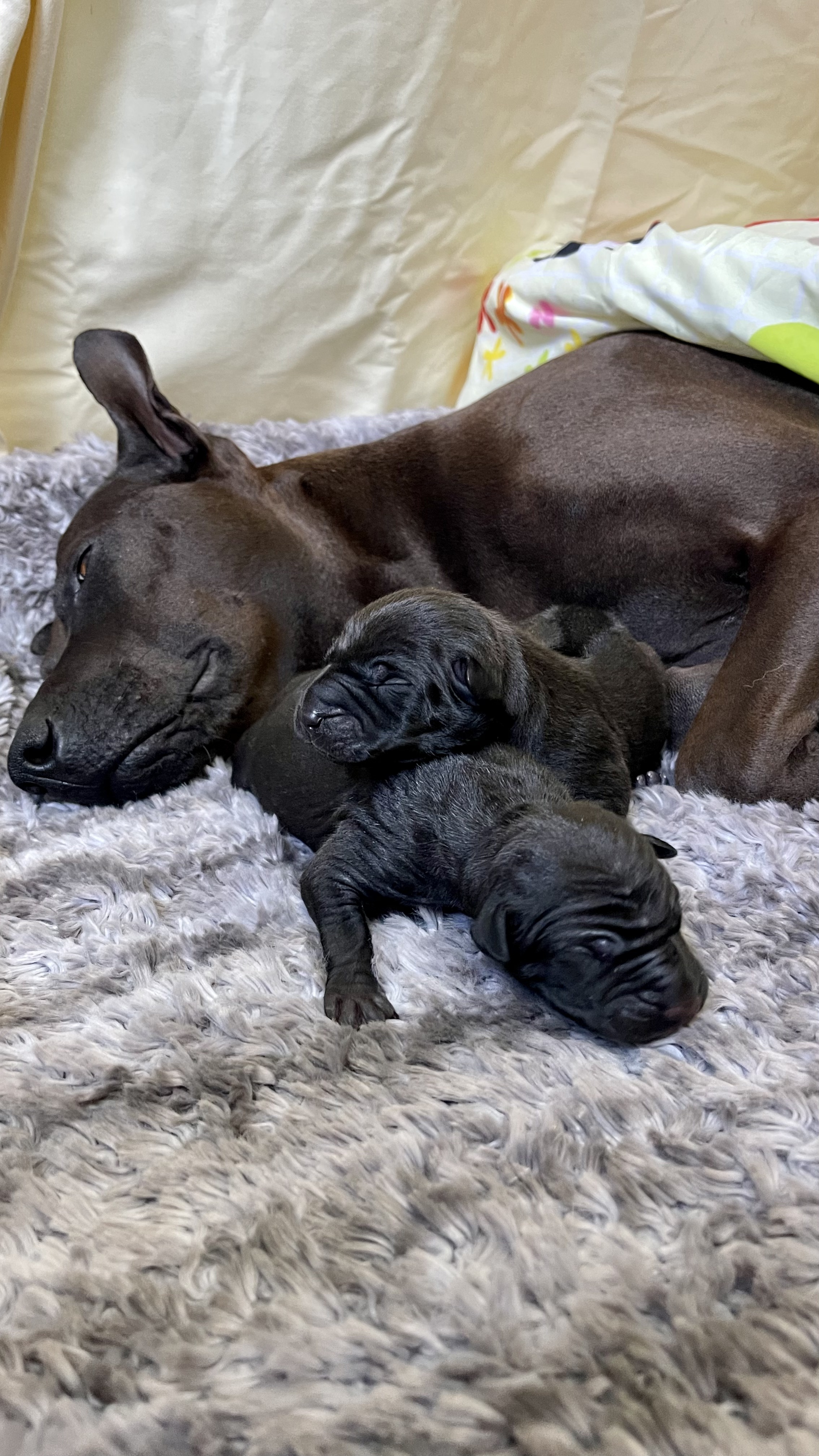 Unsere Welpen haben das Licht der Welt erblickt. Der Wurf ist wesentlich kleiner als erwartet und verlief leider nicht komplikationslos. Die Geburt startete gut aber durch eine Verdrehung des Gebärmutterhorns konnte Sola die Welpen leider nicht auf natürlichem Weg zu Welt bringen. Deshalb liessen wir einen Kaiserschnitt durchführen und Sola im Anschluss gleich kastrieren. Da mag jeder anders darüber denken aber das Wohlergehen meiner Hündin steht im Vordergrund und ich würde ihr nach einem Kaiserschnitt keine weitere Schwangerschaft zumuten und die Gefahr einer Gebärmutterentzündung kann somit ausgelöscht werden. So können wir voller Stolz verkünden: Sola und den beiden schwarzen, korrekten Hündinnen geht es hervorragend