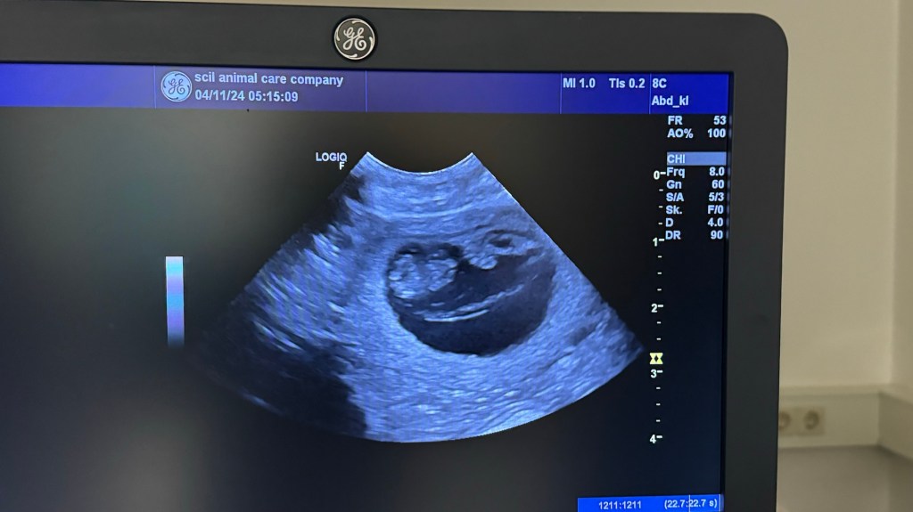 Die Föten sehen nun aus wie kleine Hunde, da die Entwicklung der Organe abgeschlossen ist. Auch das Geschlecht wäre nun bestimmbar und die Fellfarbe entwickelt sich. Auch der Herzschlag der Welpen ist nun mit einem Stetoskop hörbar. Sunray hat schon ein richtig kleines Kugelbäuchlein.